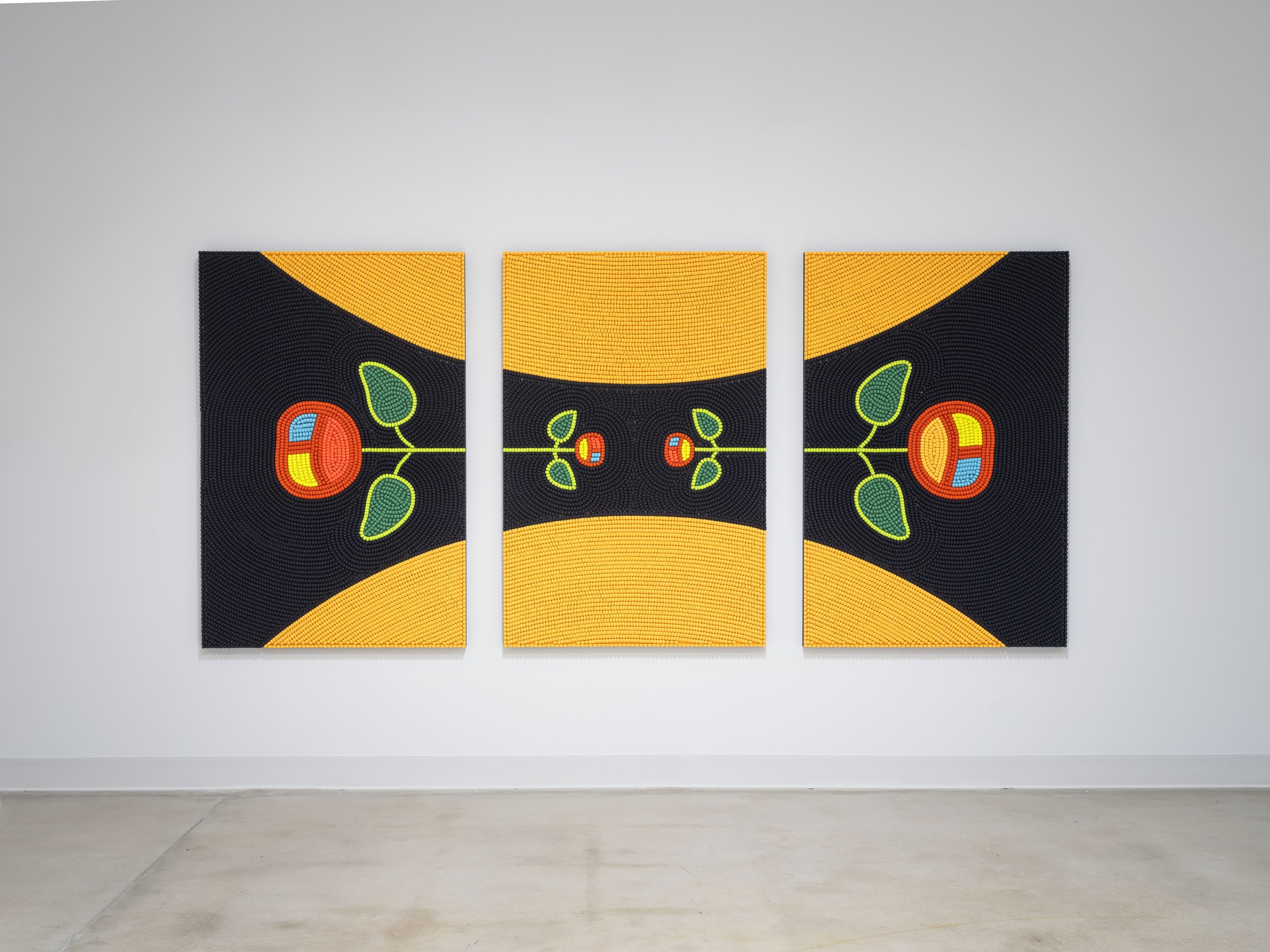 Known for her sweeping beadwork compositions, Renée Condo’s visual language grows from the Mi’gmaq understanding that everything in existence is bound in relationship—each action, material, and being influencing the other in a living continuum. Working with thousands of individually sanded, painted, and arranged wooden beads, she constructs rhythmic surfaces that heighten attention to color, texture, and form. Each bead functions as both a distinct element and part of a greater whole, echoing the artist’s ongoing inquiry into the balance between individual and collective harmony.