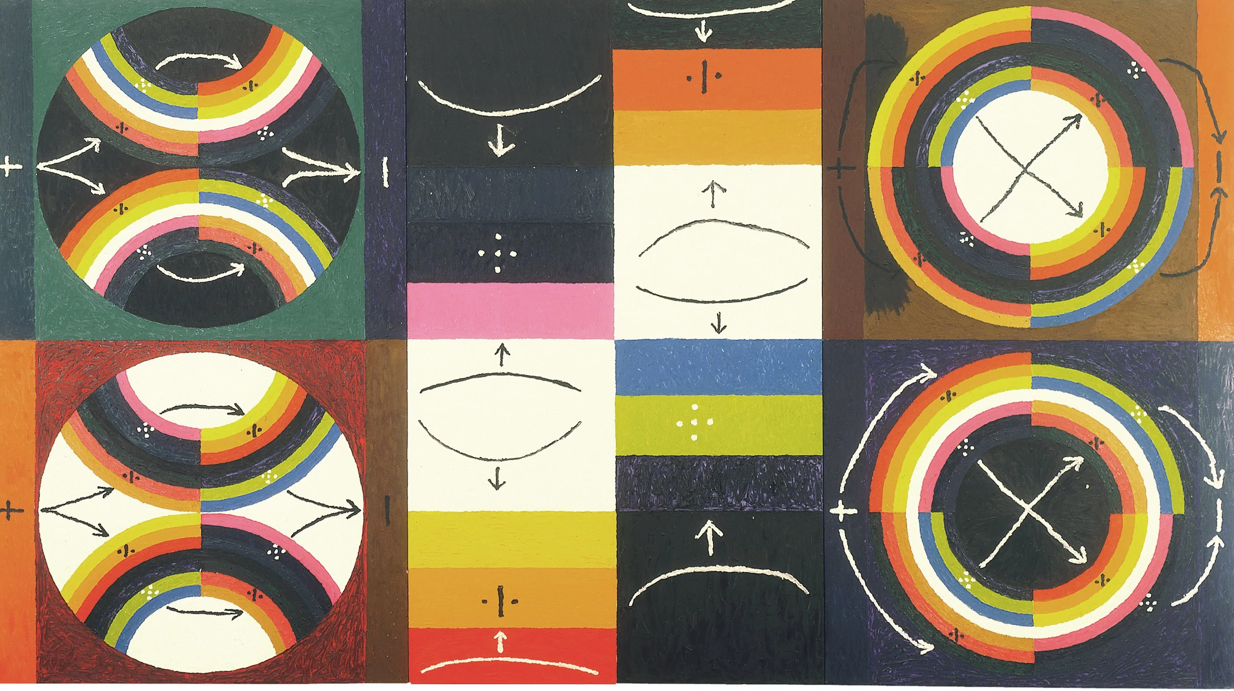 Strongly influenced by Guatemalan textiles and pre-Columbian art, Jensen also drew inspiration from sources ranging from the intuitive to the theoretical and scientific. James Clerk Maxwell’s formulation of electromagnetism and foundational texts like the I Ching, Johann Wolfgang von Goethe’s Theory of Color (Zur Farbenlehre) (1810), and J. Eric S.