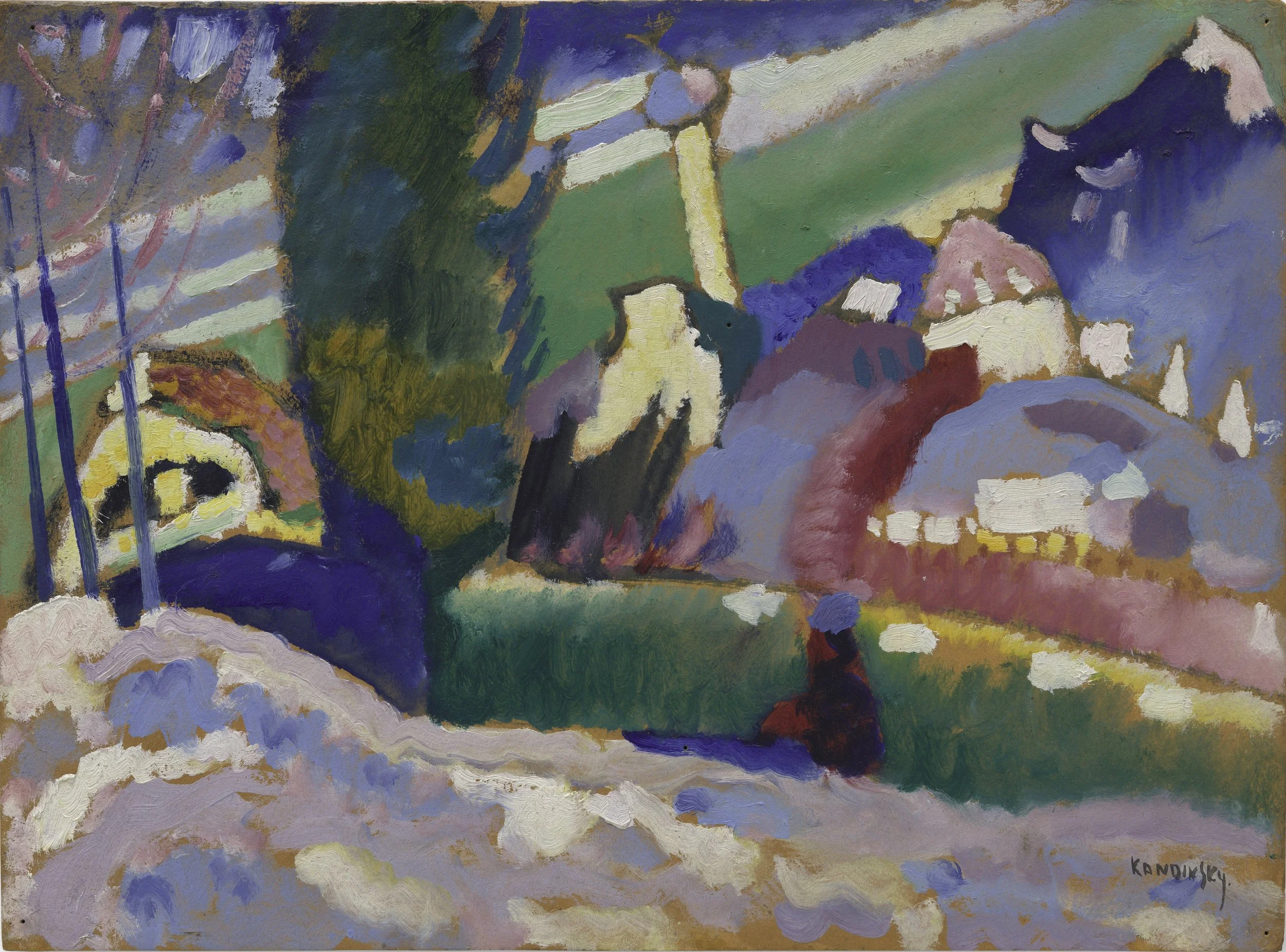 Vasily Kandinsky, Winter Landscape with Church (Winterlandschaft mit Kirche), 1910–11. Oil on board, 13 ×17 1/2 in.(33 ×44.5 cm). Solomon R. Guggenheim Museum, New York, Solomon R. Guggenheim Founding Collection, by gift 37.502 Photo: Alison Chipak, Solomon R. Guggenheim Museum, New York