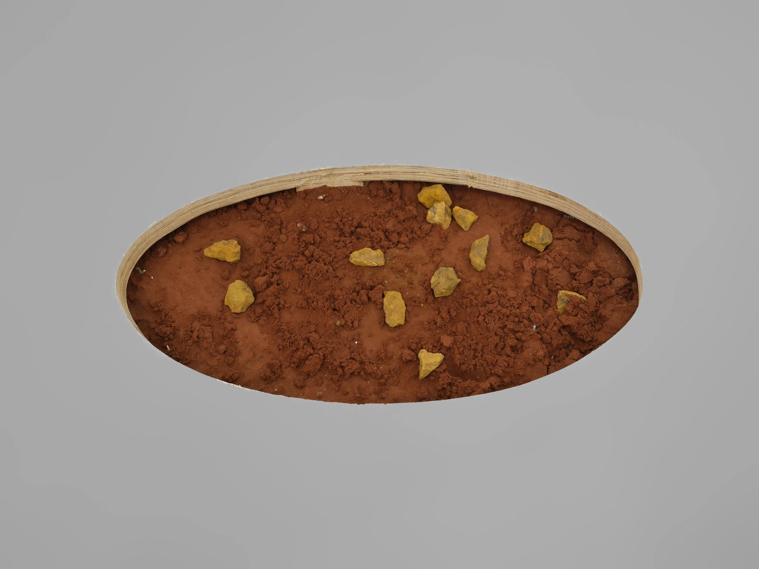 Anchoring the main exhibition space, Tierra de Substrato Arecibo Hematita (Parabolic Monolith Hematite), builds upon Colón’s distinctive organic minimalist language while further elucidating her personal history and often-illegible identity as a diasporic Puerto Rican artist. In Tierra de Substrato Arecibo Hematita, Colón's use of red earth from her family’s plot of land in Arecibo connects formative moments of a childhood surrounded by violence and displacement to an early fascination with outer space and the cosmos nurtured at the Observatory de Arecibo—until recently the largest telescope in the world. A deeply personal work, Tierra de Substrato Arecibo Hematita, is the bedrock that lies beneath the artist’s own biographical story, concealed within layers calcified by the broader implications of Puerto Rico's stratified history with colonialism. The distinctive ochre color of Puerto Rico’s red earth comes from the mineral hematite, an iron oxide formed over time. Hematite, one of the earliest pigments used by man, appears in ancient cave drawings throughout the world, as well as on other planetary bodies. In Tierra de Substrato Arecibo Hematita, Colón constructs a vessel that imagines an expansive cosmic world filled with the energy of nature, ancestral memories, and a universal consciousness larger than any single individual. In imagining this vast expanse of space and time, subjective lived experiences on a human scale are absorbed into the universal, infinite form of the monolith—a structure shared across time by geological formations, prehistoric archeological structures, and ancient architectures. Colón’s larger-than-life totemic structure encapsulates a transformative moment in time, where the complexities of an infinite cosmos, composed of cosmic matter and energy, swirl within its confines.