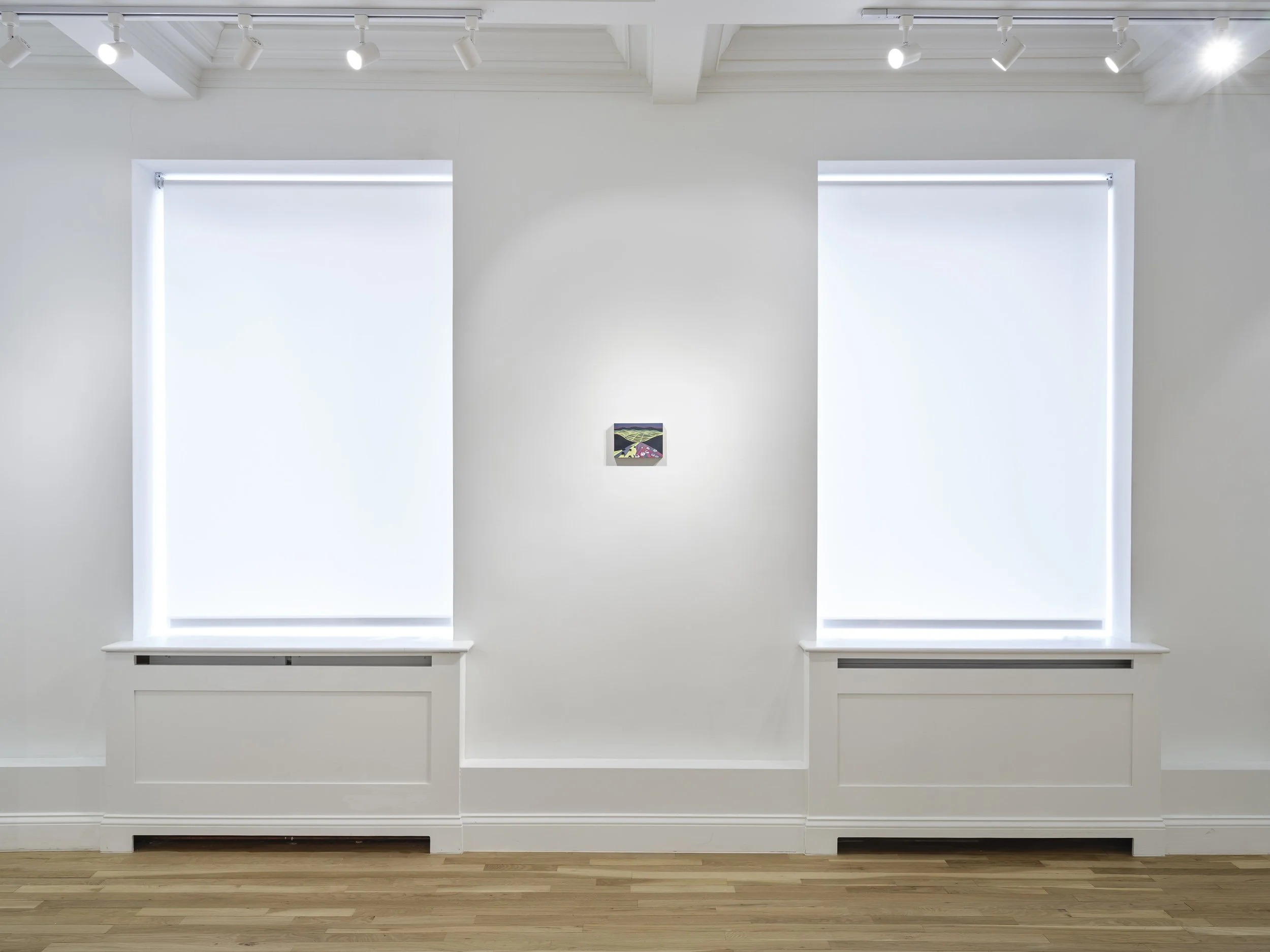 Throughout the exhibition, Cedar’s compositions maintain a careful balance between restraint and emotional charge. Her flattened spaces and pared-down figures evoke a calm, almost detached visual language, yet within this quiet structure moments of vulnerability surface. A rider and horse in Go (2026) lean forward with a sense of anticipation; a railway scene in Wait (2025) centers on the sudden burst of light where tracks converge, transforming a mundane environment into a site of suspense. By allowing subtle disjunctions to emerge within otherwise ordinary scenes, Cedar creates paintings that oscillate between the recognizable and the uncanny.