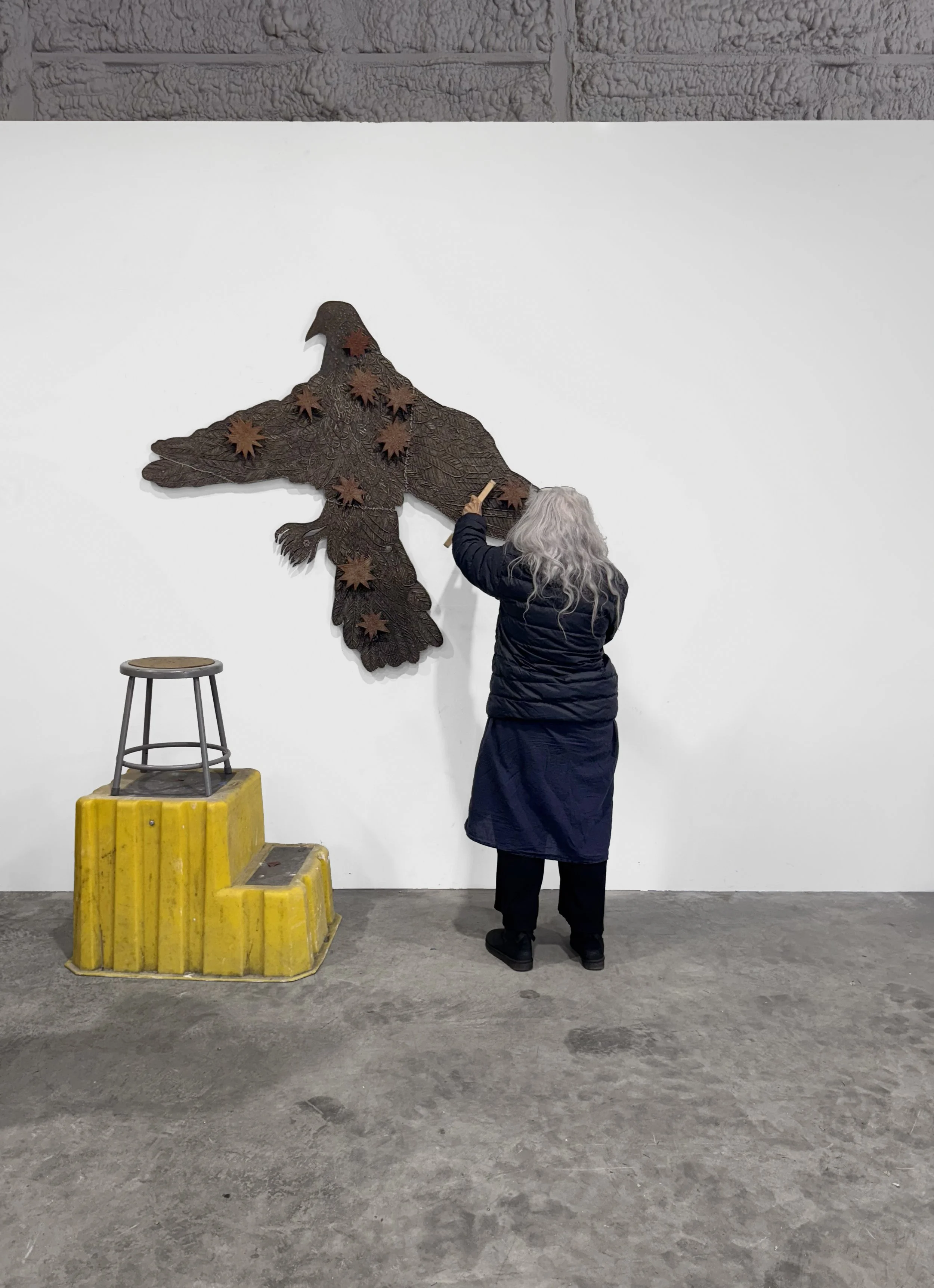 Since the 1980s, Smith has drawn inspiration for her art from folklore, mythology, history, and the natural world. Even as she has engaged in wide-ranging experimentations with various mediums and materials, in particular paper and bronze, drawing has long remained at the heart of her practice. In the graphic imagery for which she is widely known, Smith often explores the poetic resonance of birds, insects, and other non-human subjects, meditating on the agency of nature both around and within us. At 125 Newbury, Smith debuts a series of new bird reliefs in bronze. In several of these works, she eschews her usual patinated surfaces in favor of raw, unfinished metal, allowing all the marks of the casting process to remain visible like wounds. Smith’s birds are exhibited in conversation with a monumental ink-and-watercolor woodcut, Wooden Moon (2022), which measures 12 feet in width.