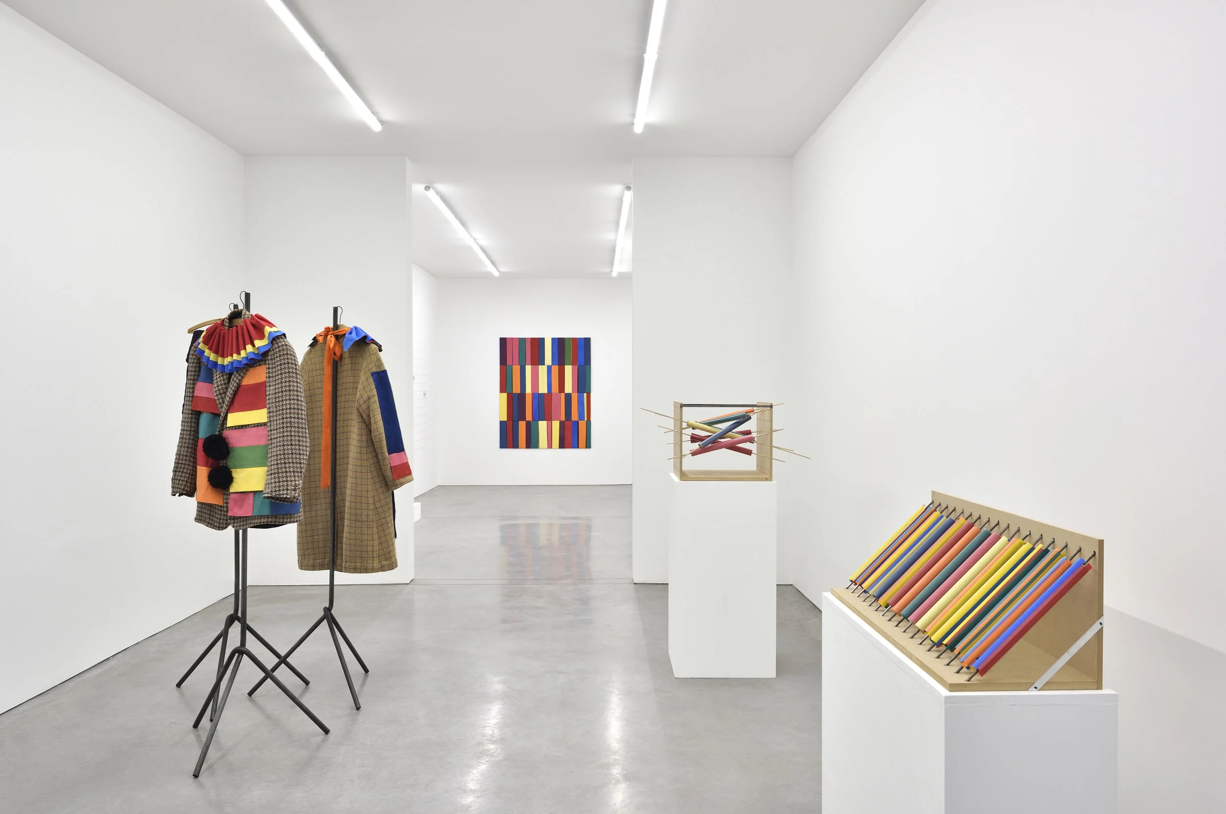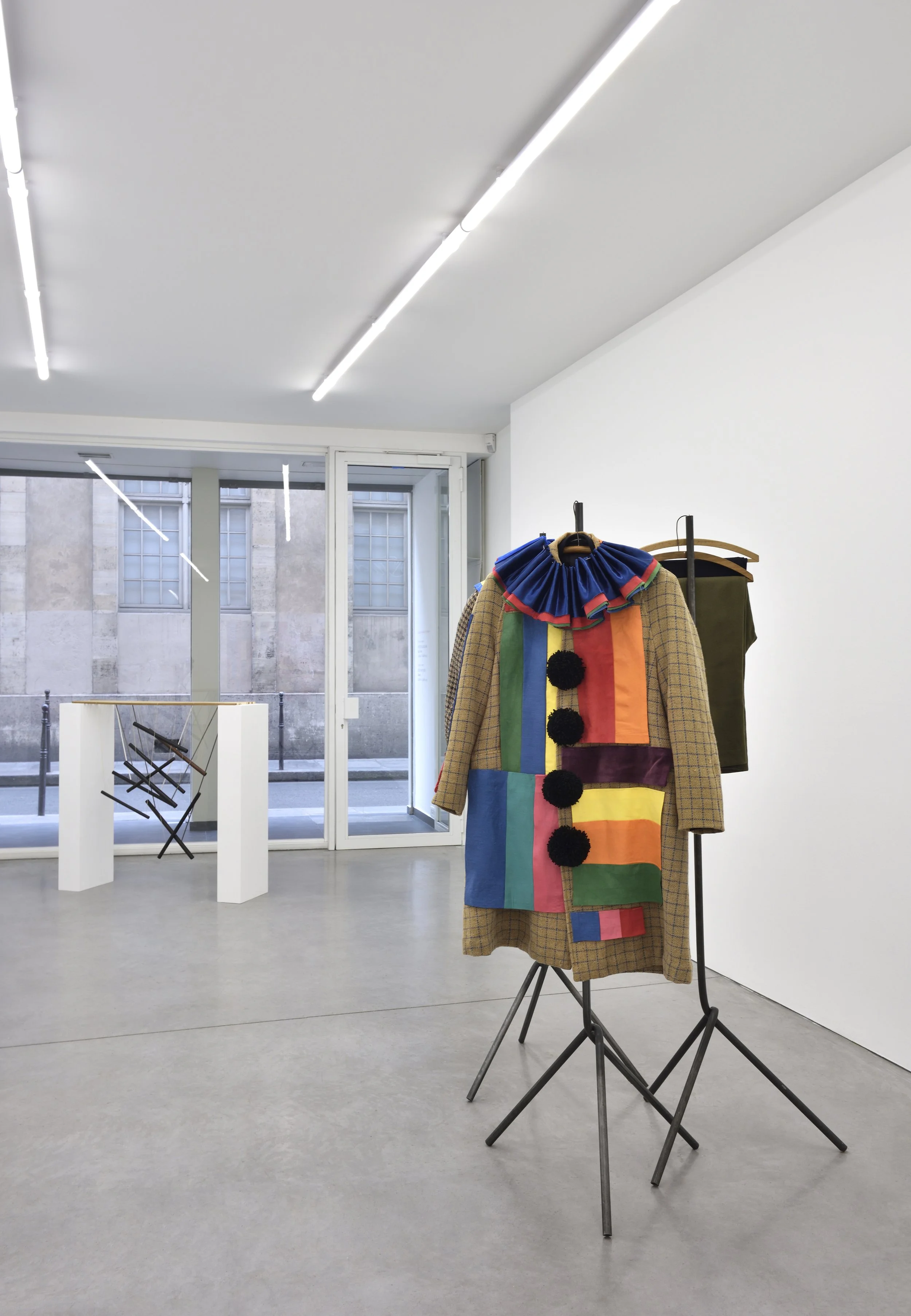 Upon entering the gallery, visitors encounter Fruit Salad, 2025, an installation comprising a jacket, an overcoat and trousers given to Fillingham by his long-time friend, the artist Tacita Dean. The set of garments, which belonged to her grandfather, Basil Dean, inspires Fillingham to evoke ENSA - The Entertainment National Service Association founded by Basil Dean in 1939. ENSA’s aim was to provide entertainment for British and Allied forces in warzones through comedians, singers, dancers and other performers who devoted themselves to providing levity for the entirety of the war. Fillingham found affinity with ENSA’s philosophy of improvisation, economy of means and inclusivity along with its affiliation with the Pierrot troupes from the time of World War I.