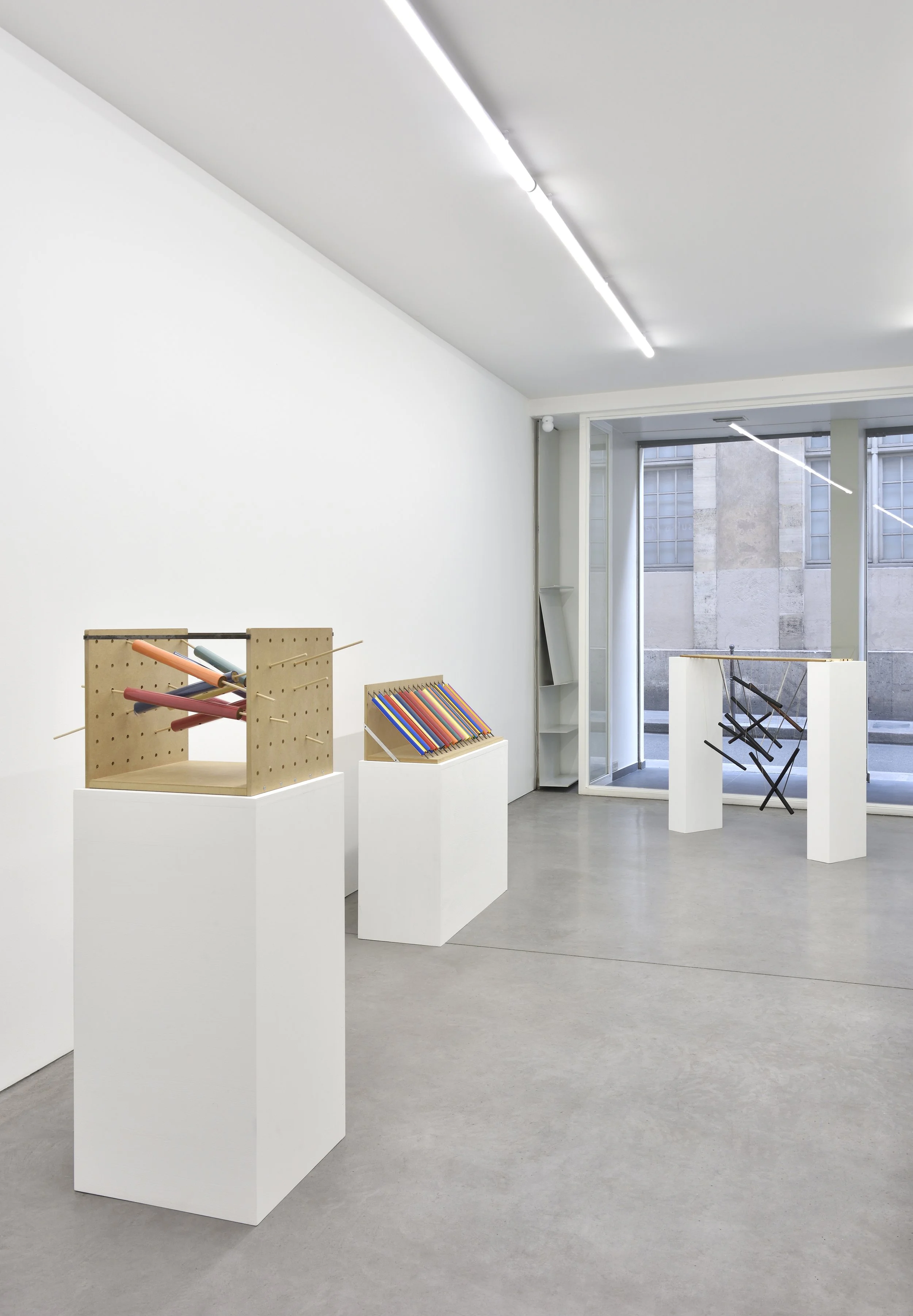 The works 17s Strip and 8s Helter Skelter, also convey theatrical qualities but in an abstract fashion; as compositions made with wooden bars covered with colored fabric or ribbon, they are equally rooted in the formal language of minimal sculpture and the visual vocabulary of folk culture. The floating diagonal shape in Small drop, 2025 —inspired by Paul Sérusier’s oil painting The Golden Cylinder from 1910— multiplies to form installations of delicate balance, at the limits of uncertainty. Here, 2025, a disregarded object that was once a tiny vessel, is enlarged, painted and formally suspended and displayed.