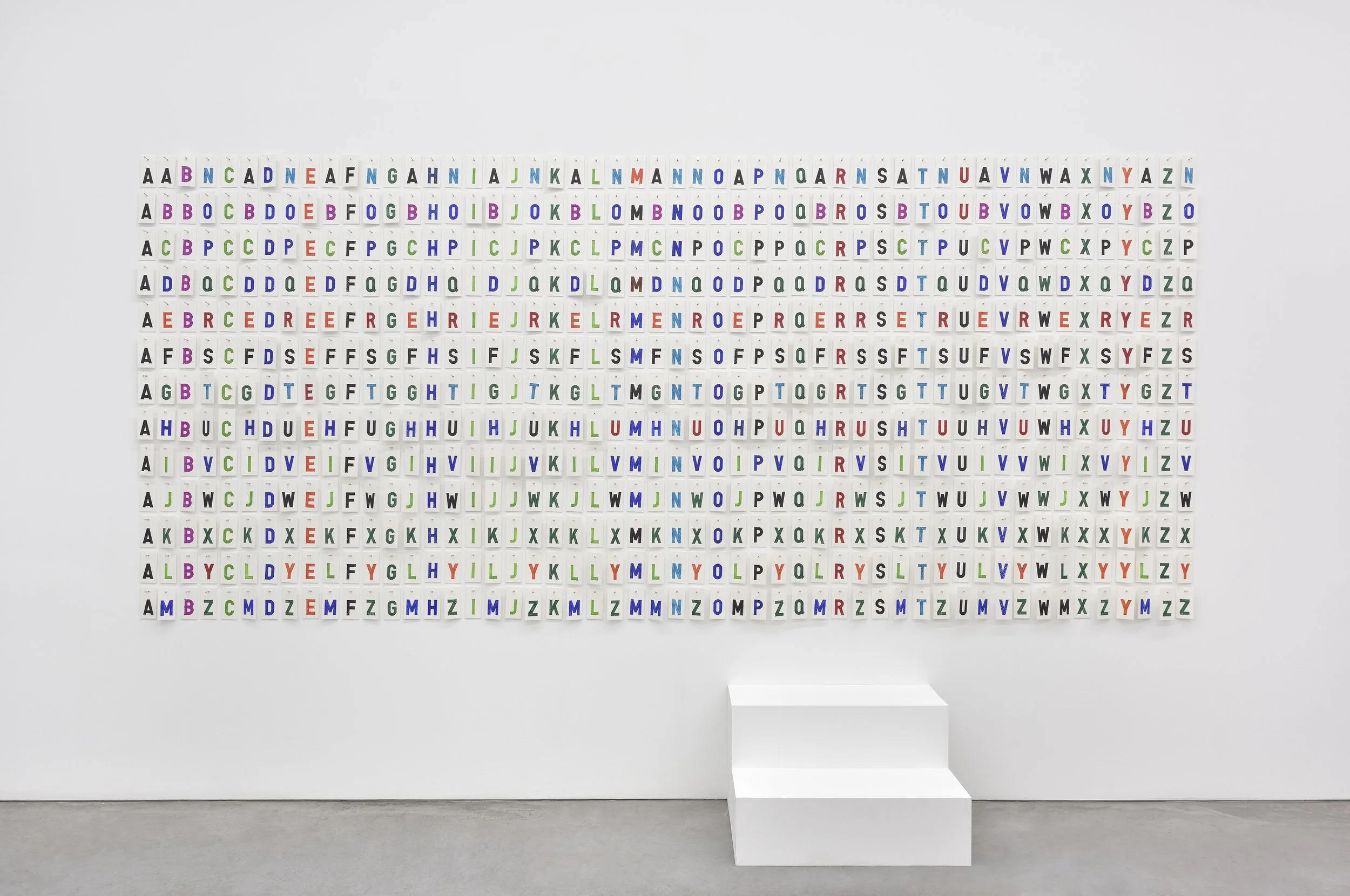 In the second space of the gallery, BF,RE,FW,DJ,CG,GJ,GB,MJ, 2024, is a wall-mounted grid of cards with alphabet letters arranged in rows and columns according to a rigorous layout designed to remain indecipherable. The audience is invited to select letters to make up the initials of people they wish to be celebrated or recognized, with wooden steps for visitors to reach wherever they wish. This work was first made as a contextual response for Exile Street / High, curated last year by artist Peter Lewis at Ealing Project, London. It embraced the fluid and radical musical history of the space for many well known rock stars, whilst creating an intergenerational space for new audiences.