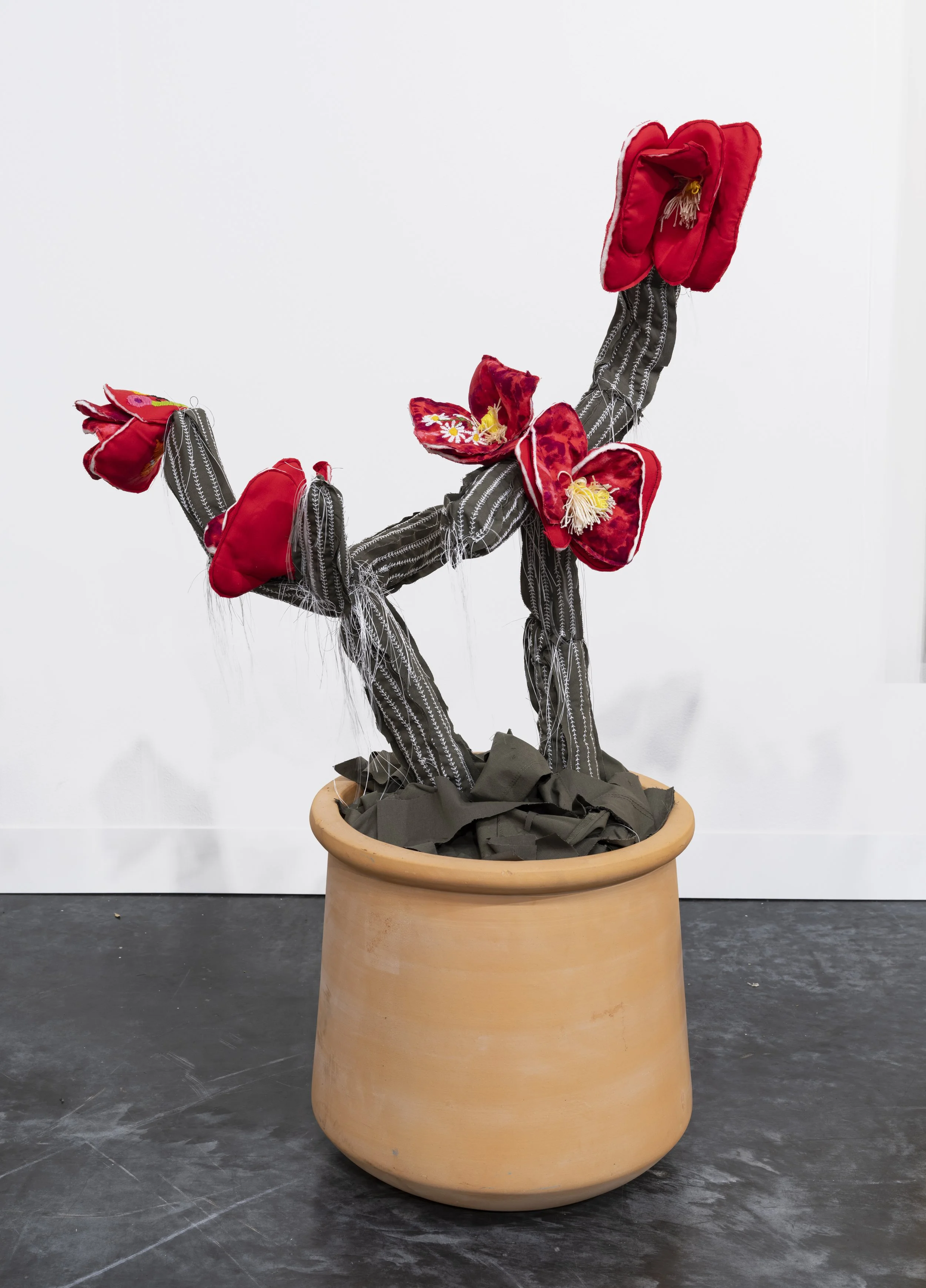 At the fair Cabrera debuts three of her signature cacti sculptures made from U.S. Border Patrol uniform fabric and copper wire set in a terracotta pot. These materials carry deep significance and speak directly to the themes that define her practice. Each work begins with the title Space in Between followed by the initials of the undocumented collaborators who helped create it. Their initials J.S., N.P., and S.P. become part of the sculpture itself. Cabrera protects their identities while honoring their participation which gives the works a powerful sense of lived experience and shared authorship. The sculptures hold layers of meaning tied to the border region as well as ideas of reclamation and resilience.