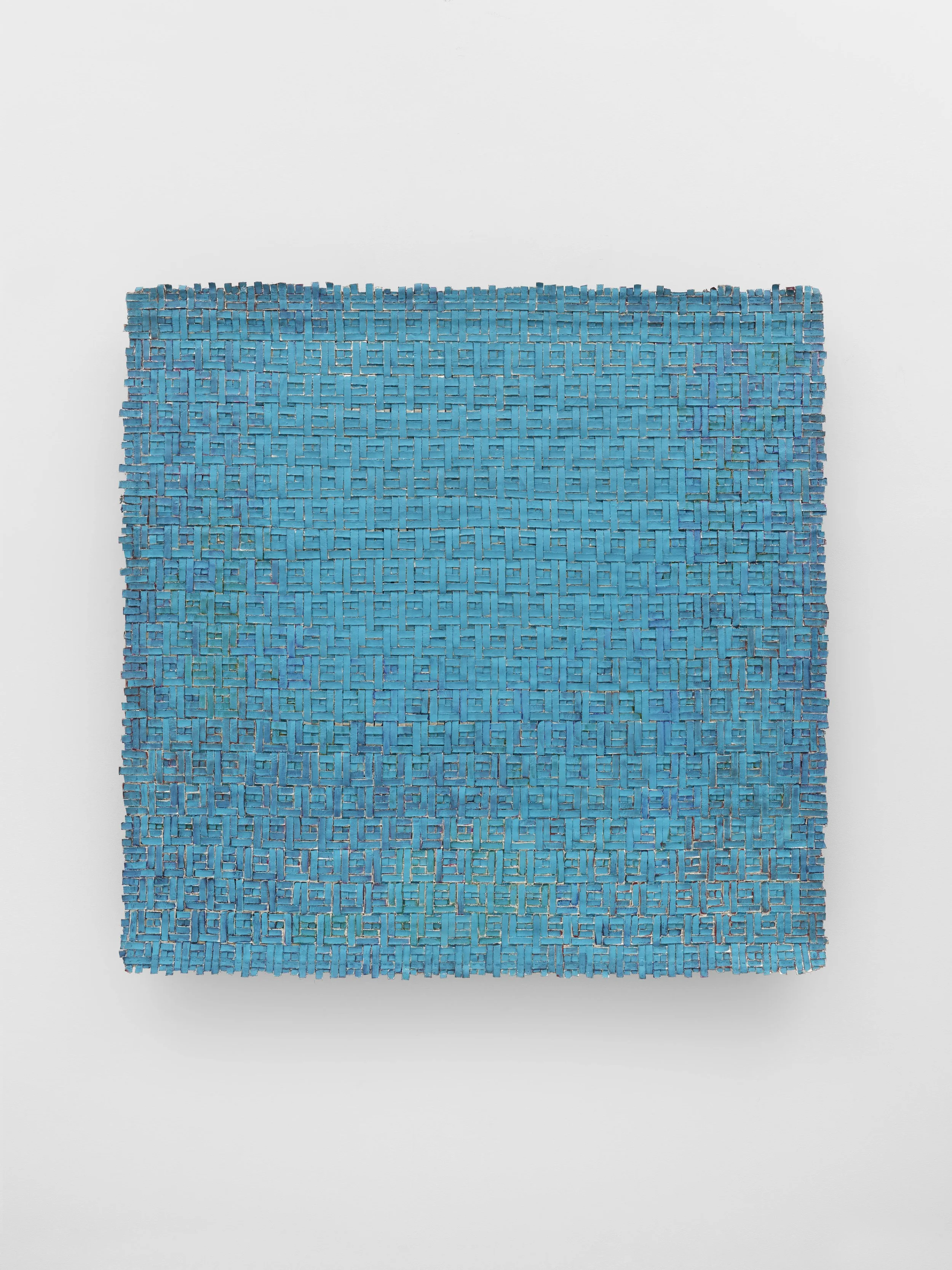 Olga de Amaral Azure, 2013 Linen, gesso, acrylic, Japanese paper, pigment, and palladium 152.4 x 154.9 x 1.9 cm 60 x 61 x 3/4 in © Olga de Amaral, Courtesy Lisson Gallery