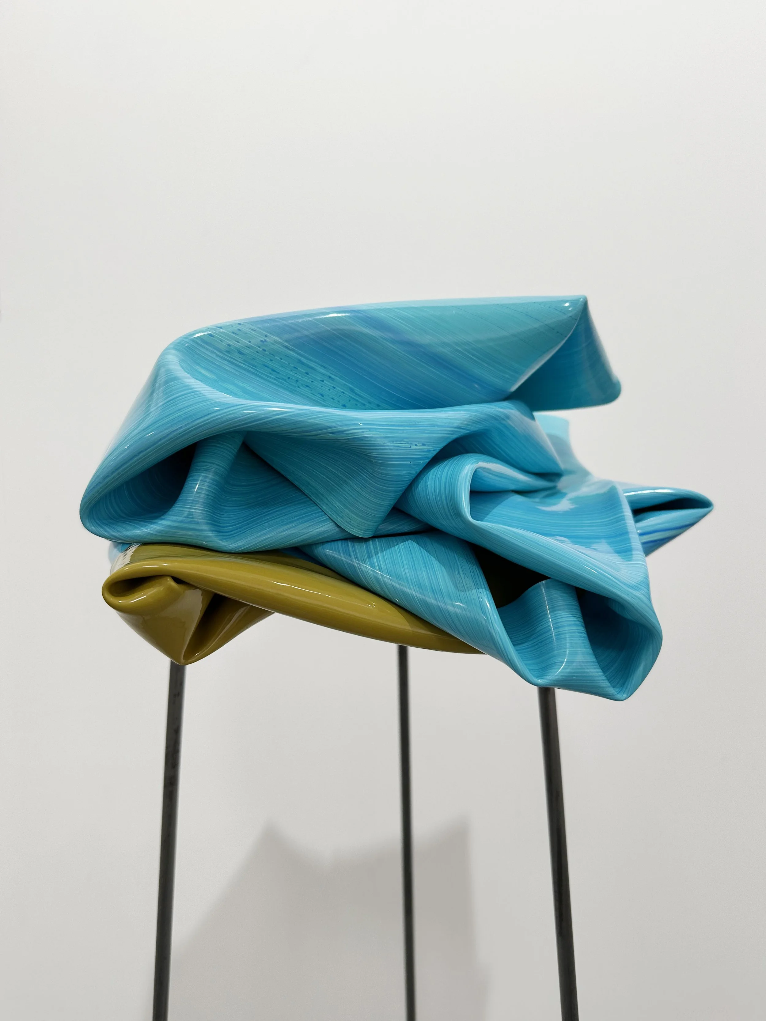 Helen Calder, Aqua Stack 2025. Acrylic paint and steel frame, 122 x 33 x 33 cm. Two Rooms Tāmaki Makaurau Auckland