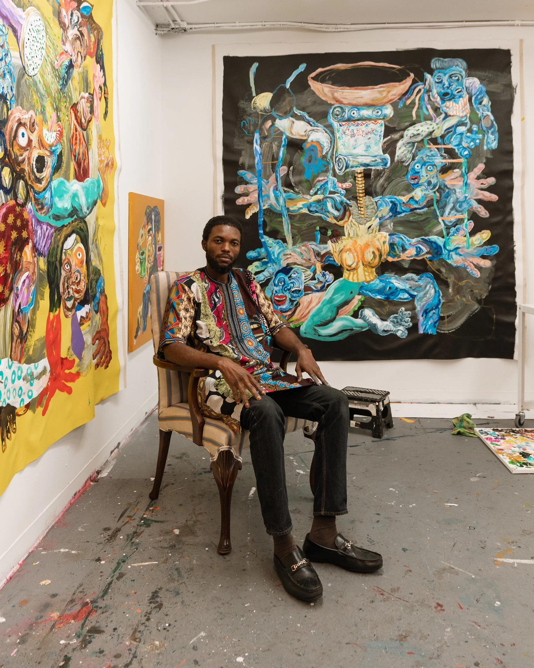 Cristiano Mangovo (b. 1982) is an Angolan visual artist currently based between Lisbon, Portugal, and Cabinda, Angola. As a child, he fled the Angolan Civil War to the Democratic Republic of Congo, where he went on to study at the Academy Des Beaux-Arts. Many of his paintings touch on the cultural differences between his two homes. The artist’s experiences in Angola have led him to advocate for social and environmental change through his artwork. His unique style combines surreal and expressionistic elements, painting distorted, multi-faceted faces, often with two mouths. The emphasis is less on the representation of the individual and more on the evocation of personality, movement, and the convergence of figure and object to showcase Mangovo’s thought. By including multiple eyes and mouths on his figures, Mangovo represents vocal figures who are alert and open.