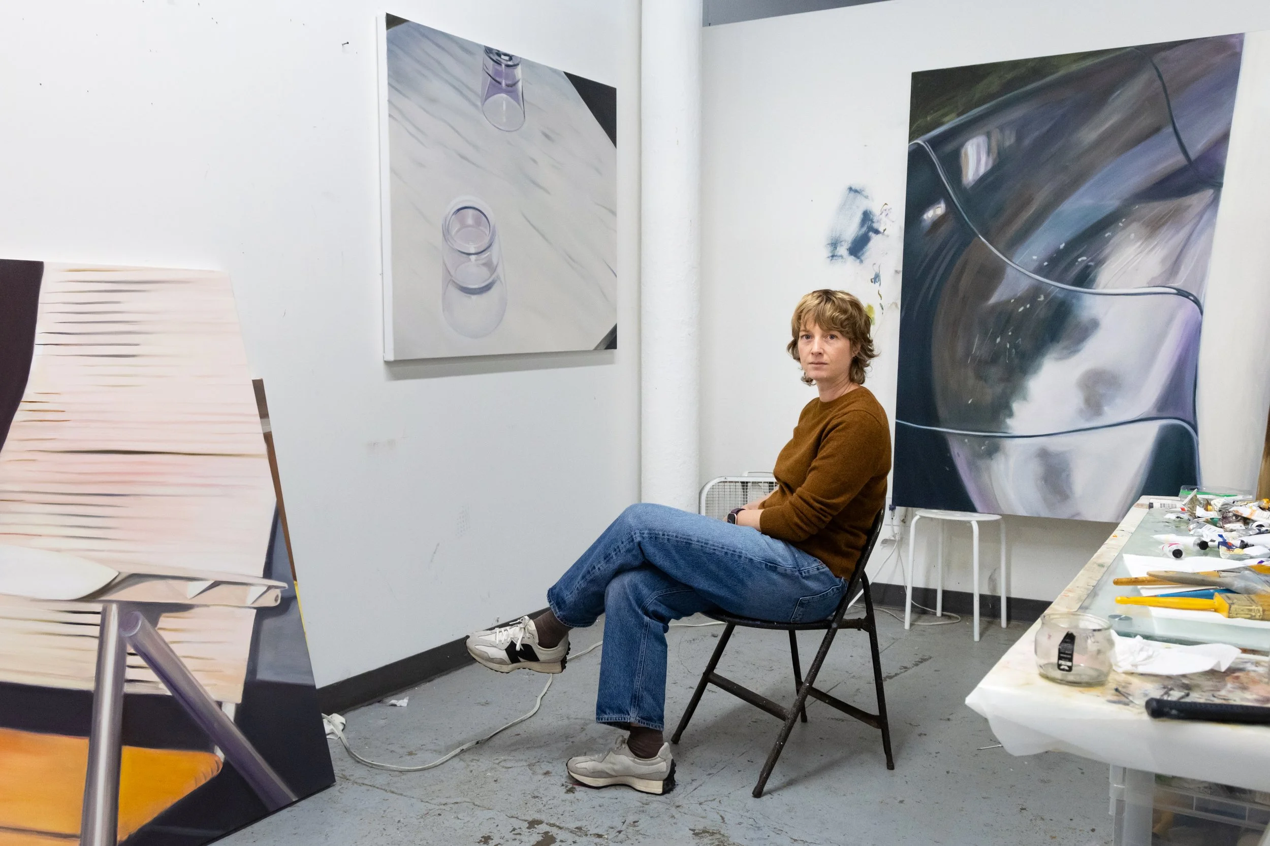 U: In your earlier exhibitions at HESSE FLATOW, the human presence has appeared in some of the works either directly and indirectly, through shadows or cropped fragments. In VACANT, the human subject disappears entirely. What does removing the figure allow you to see more clearly, and what does it prevent? The only work featuring a living form is What was that (2025), in which a small group of fish swim across the canvas. What made you decide to include this moment when the emphasis of the exhibition is on vacancy?