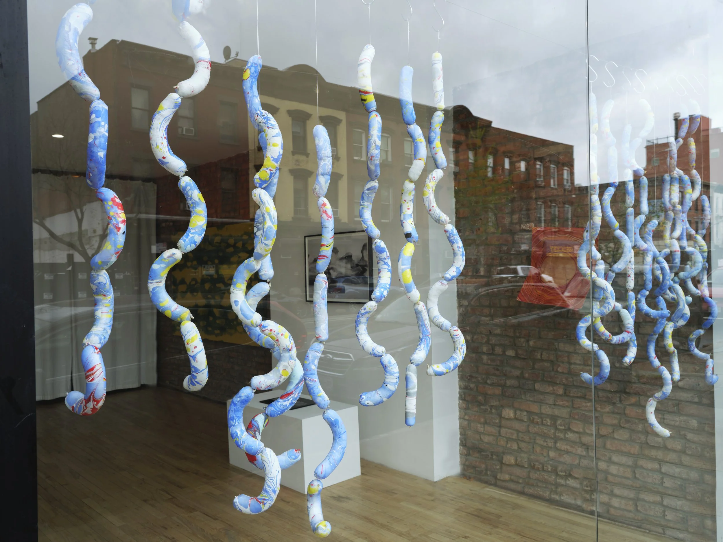 R: The sculptural work made of marbled hog intestine is both arresting and unexpected. Can you speak to the significance of using this particular material, especially considering its historical role in preservation, and how it functions within the context of this show?