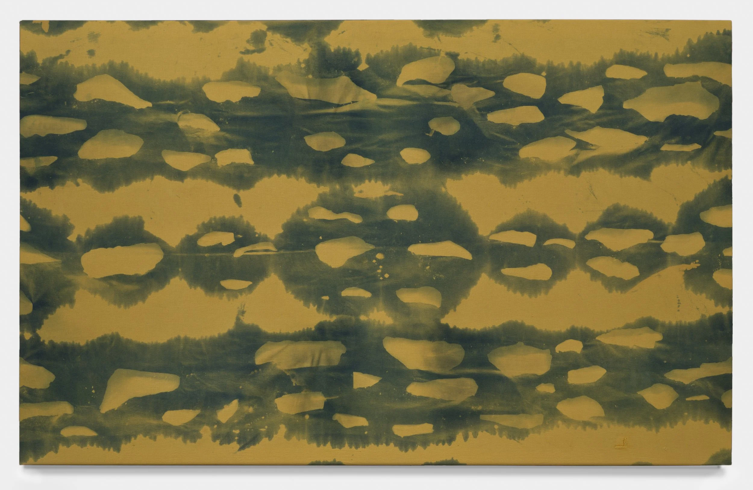 R: In your cyanotype made on a found blanket, stones act as masks to register presence through absence. How does this piece, and your use of elemental processes more broadly, expand your exploration of memory, indexicality, and the natural world?