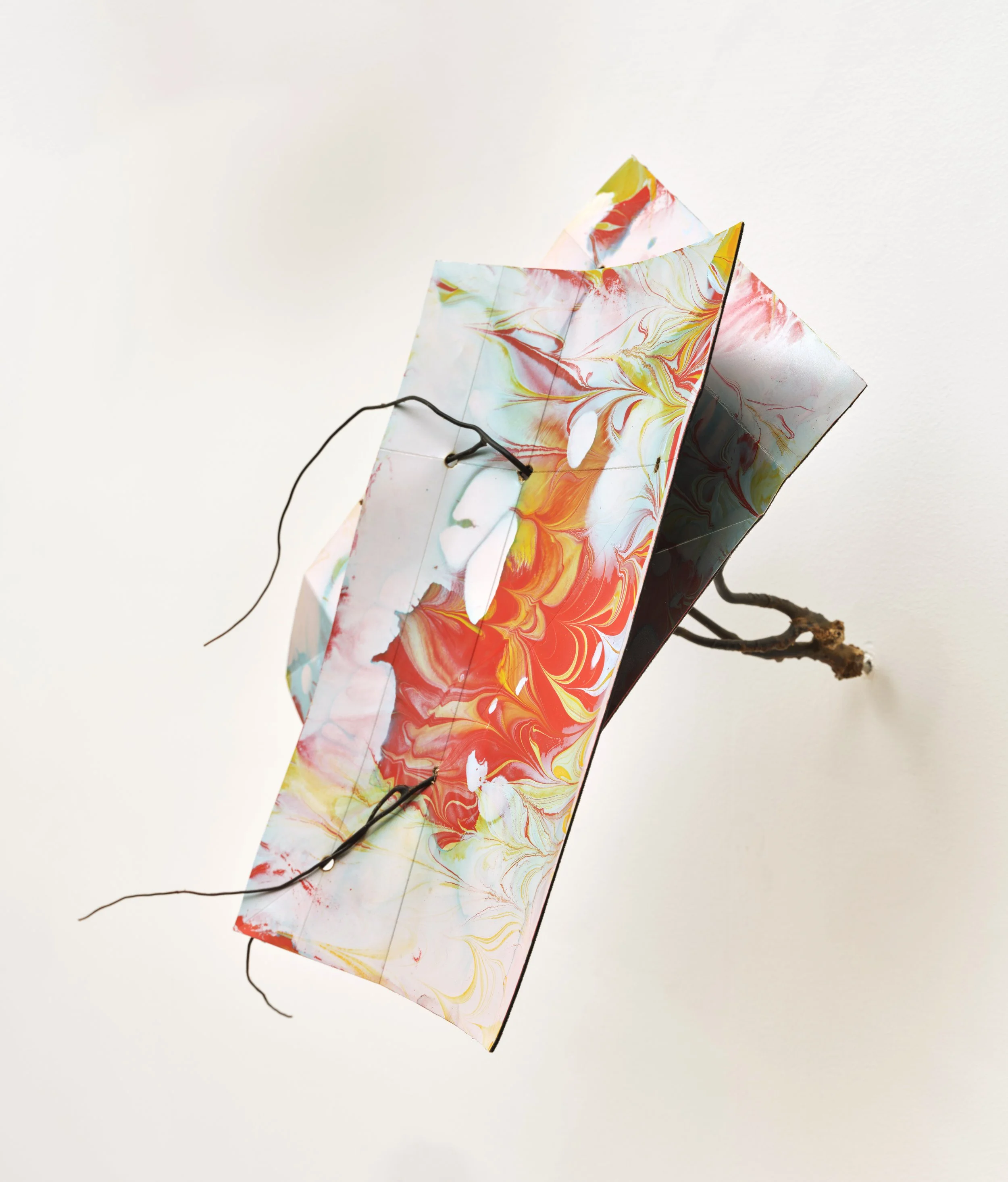 R: Paper marbling appears repeatedly in the exhibition, not only as a technique but also as a conceptual metaphor for resisting fixed classification. What drew you to this process, and how do you see it dialoguing with the more rigid or taxonomic visual languages you critique?