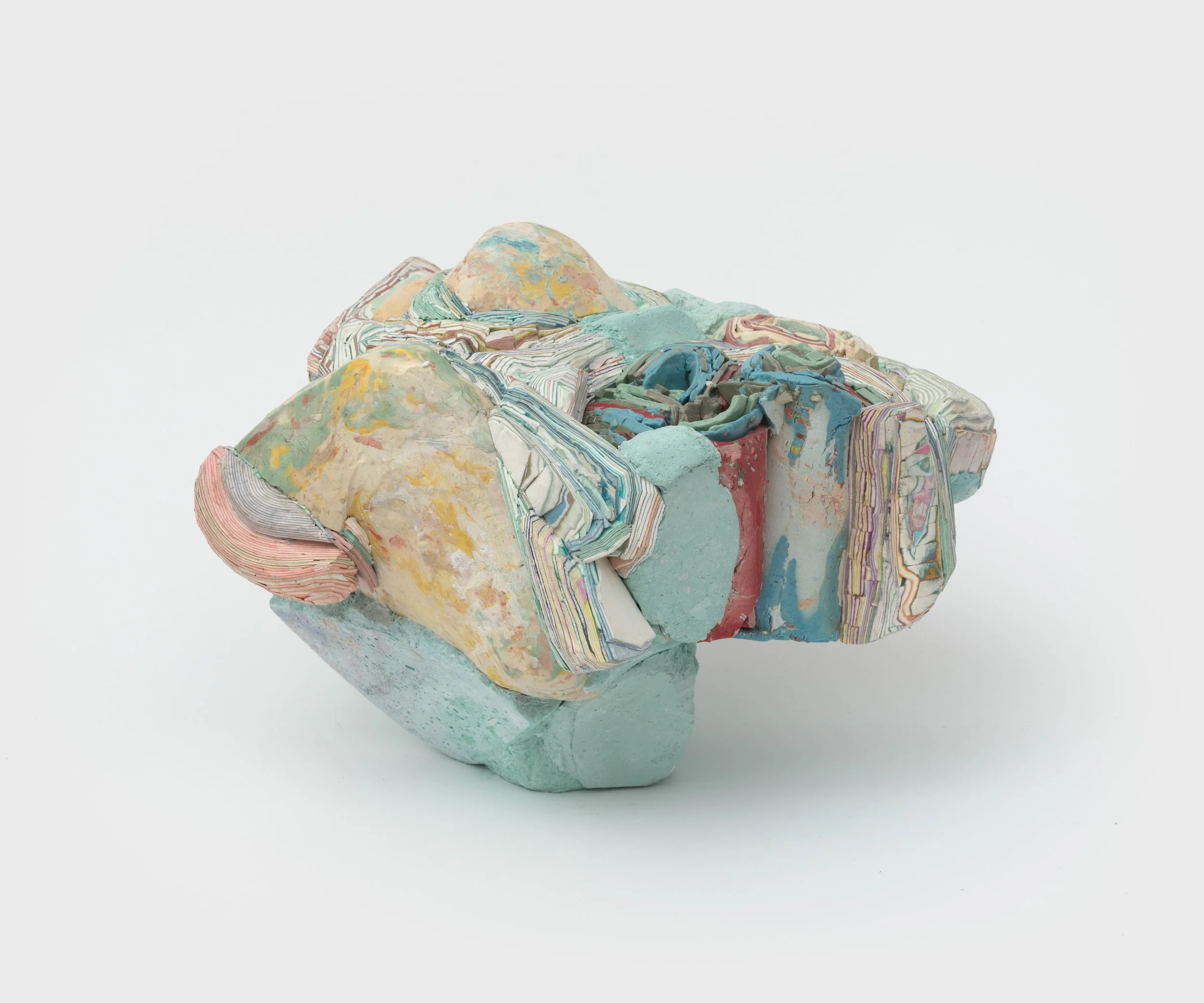 Hilary Harnischfeger Ron champ, 2026 paper, ink, dye, mica, hydrostone, ceramic, apophyllite 23 x 19 1/2 x 11 in (58.4 x 49.5 x 27.9 cm)