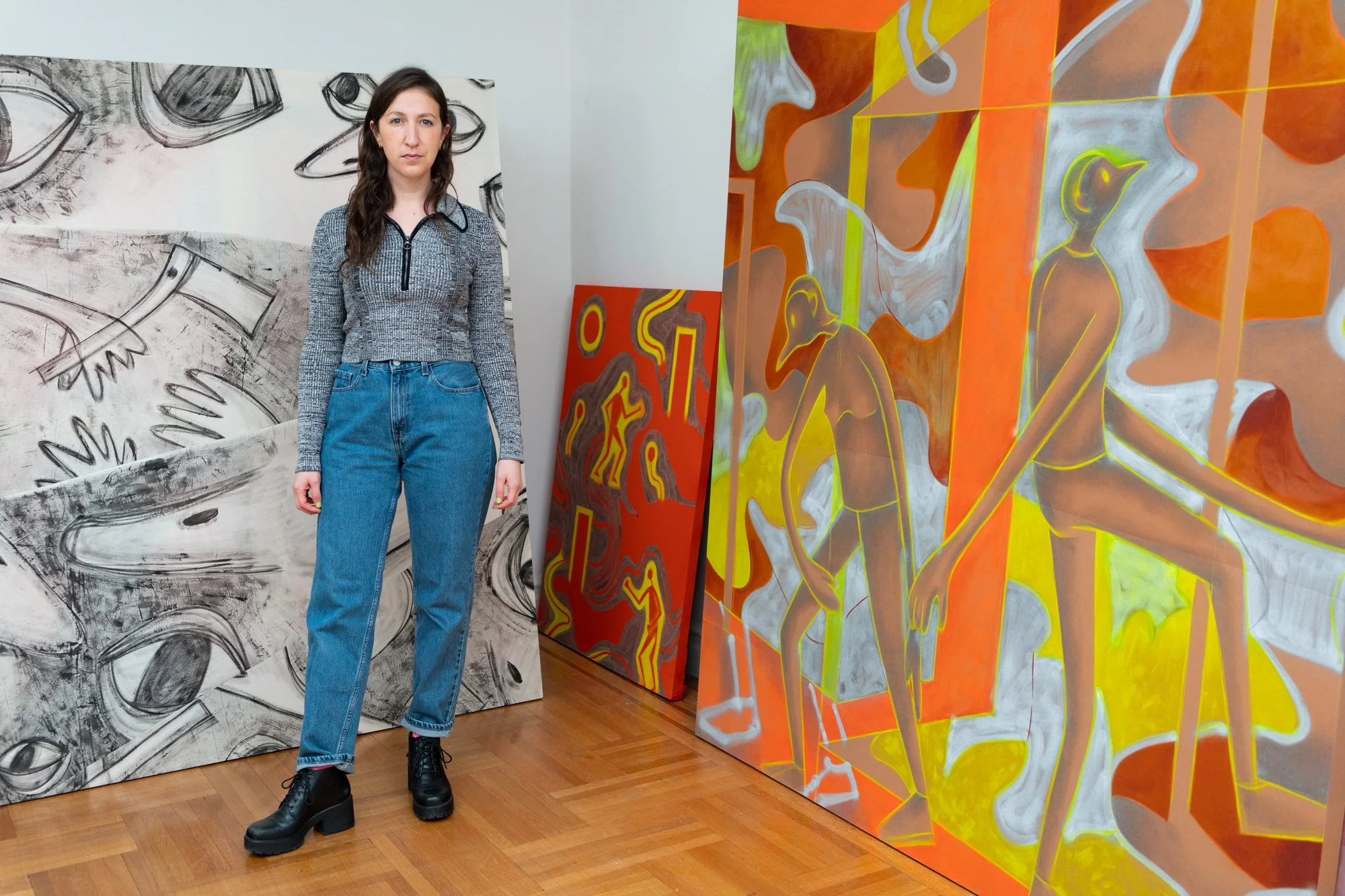 J: My process has shifted over the years in terms of scale and material choices (a few years ago, I was painting on sourced fabrics), but the subject is consistent. I've always been interested in the way figures interact in relation to each other and their environments, and the ways these physical relationships suggest charged psychological ones.