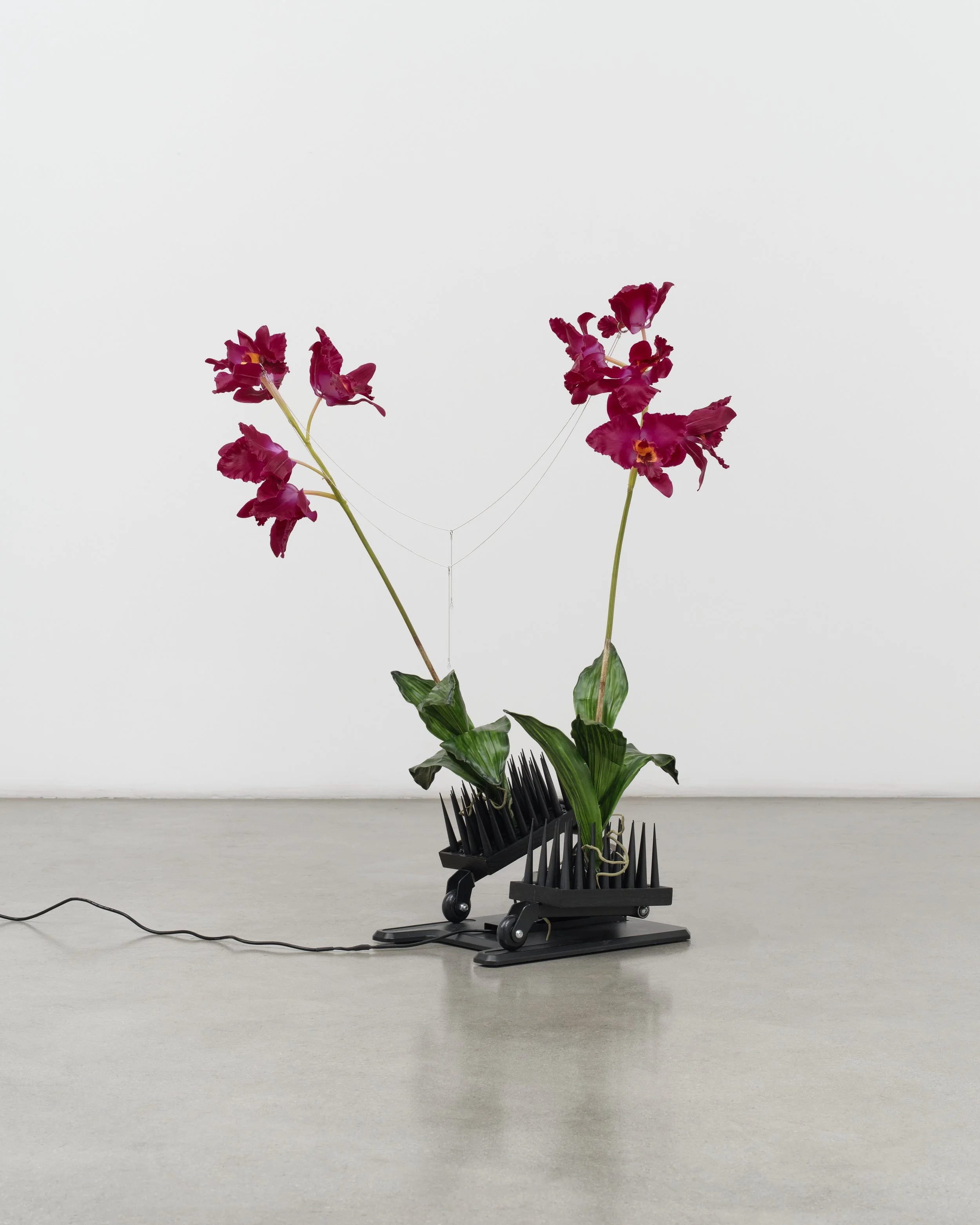 Rachel Youn Perfect Lovers II, 2026 under-desk elliptical machine, artificial orchids, wood, paint, bird spikes, glass, snake chain, hardware 41 x 28 x 38 in (104.1 x 71.1 x 96.5 cm). Courtesy of the artist and Night Gallery, Los Angeles. Photography by Nik Massey.