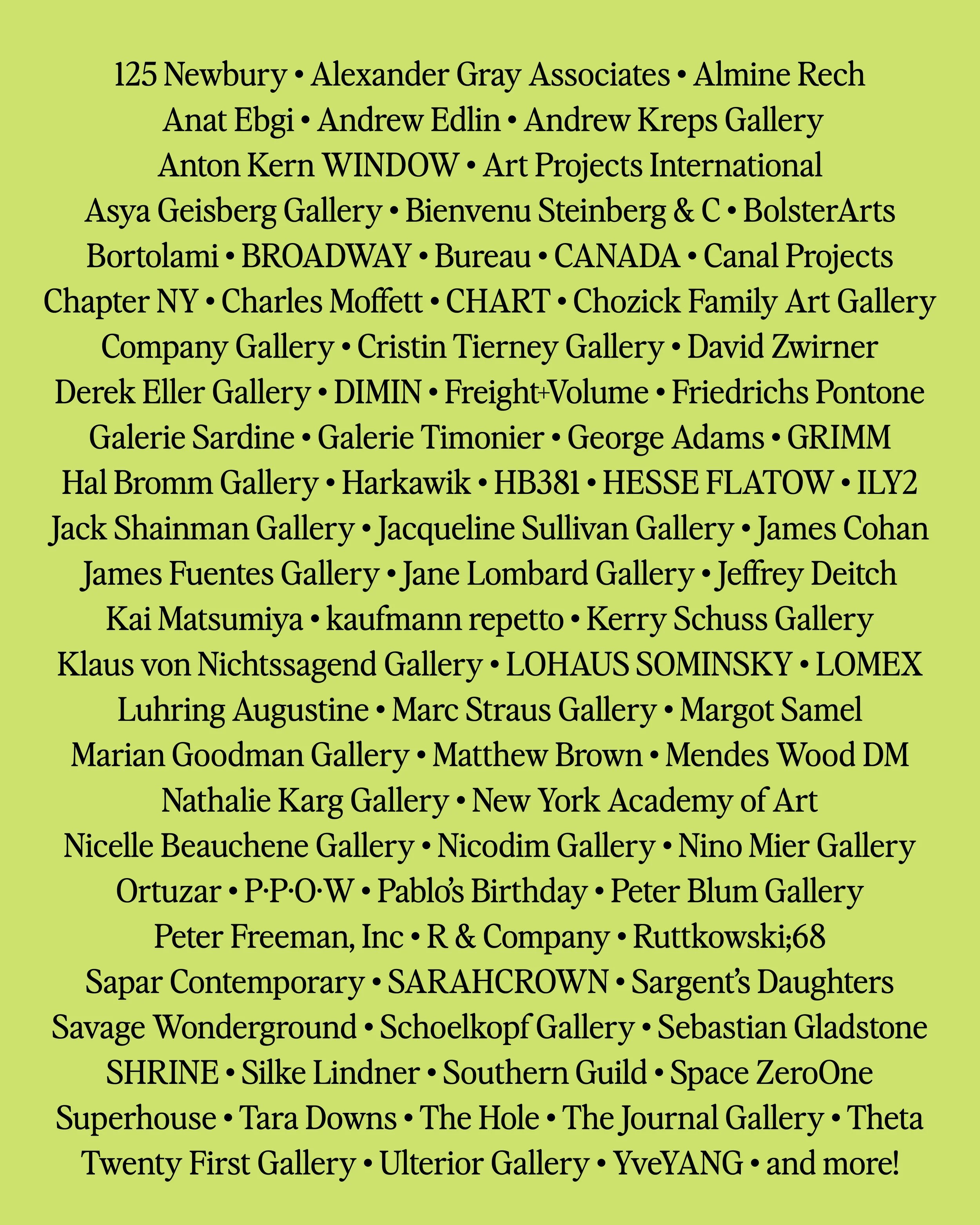 This event will coincide with Art Fair Week, offering a special late-night opportunity to visit and explore the neighborhood's vibrant gallery scene. To name a few of the amazing lineup of participating galleries, including P•P•O•W, Alexander Gray Associates, Marian Goodman, Peter Blum Gallery, Matthew Brown, and many more.