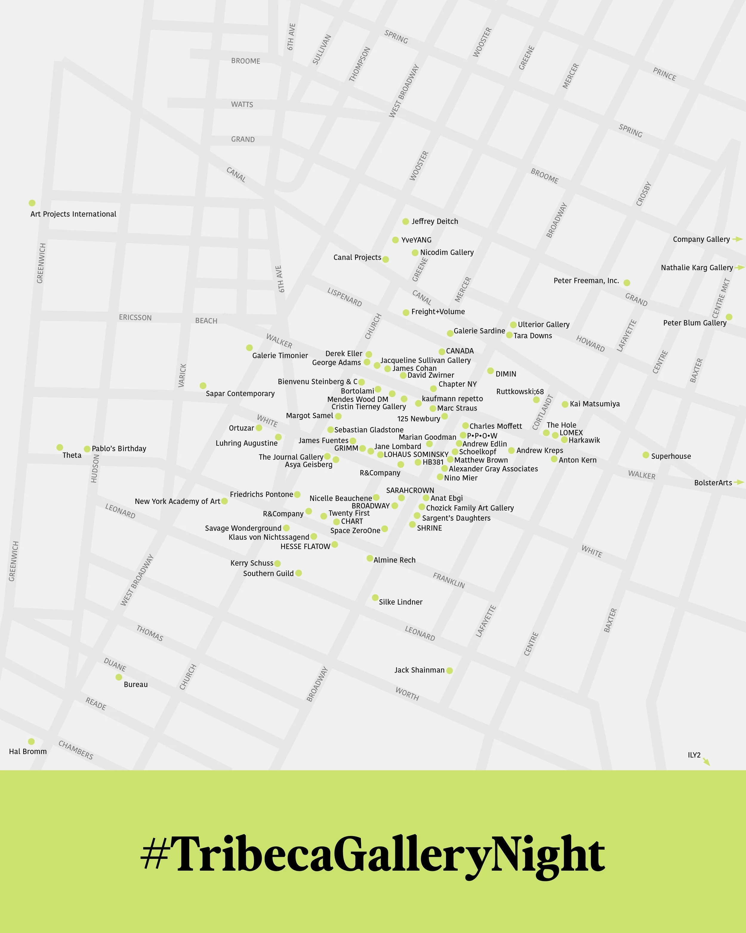 This is an industry-led initiative, with galleries participating free of charge—there are no sponsors or financial backers. We’re a community coming together to promote foot traffic in Tribeca during Art Fair Week and to celebrate the strong camaraderie among our local galleries.